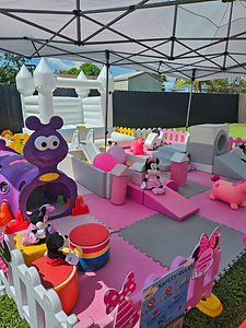 Size of the Playground 20' X 13') +7' Wby 11'L by 7.8' H of bounce house. Includes: 1 Climb and Slide Set 1 Caterpillar Animals Hoppers White Arc Soft Blocks Small Pink Climber Set 1 ball pit White Slide Soft Mat Playpen Fence White Bounce House (7' Wby 11'L by 7.8' H