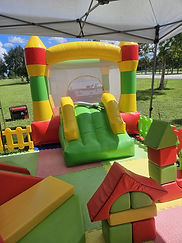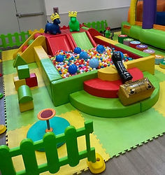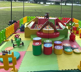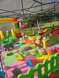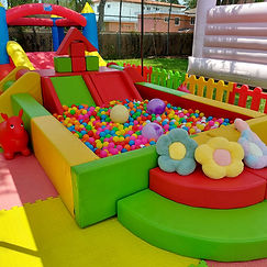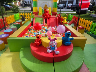 Size of the Playground 20' X 13') + 7' square bounce house. Includes: Huge Ball Pit with Slides and climb set Animals Hoppers Horse Rocket Numbers Blocks Set Soft Blocks Soft Mat Playpen Fence 1 Colorful Bounce House